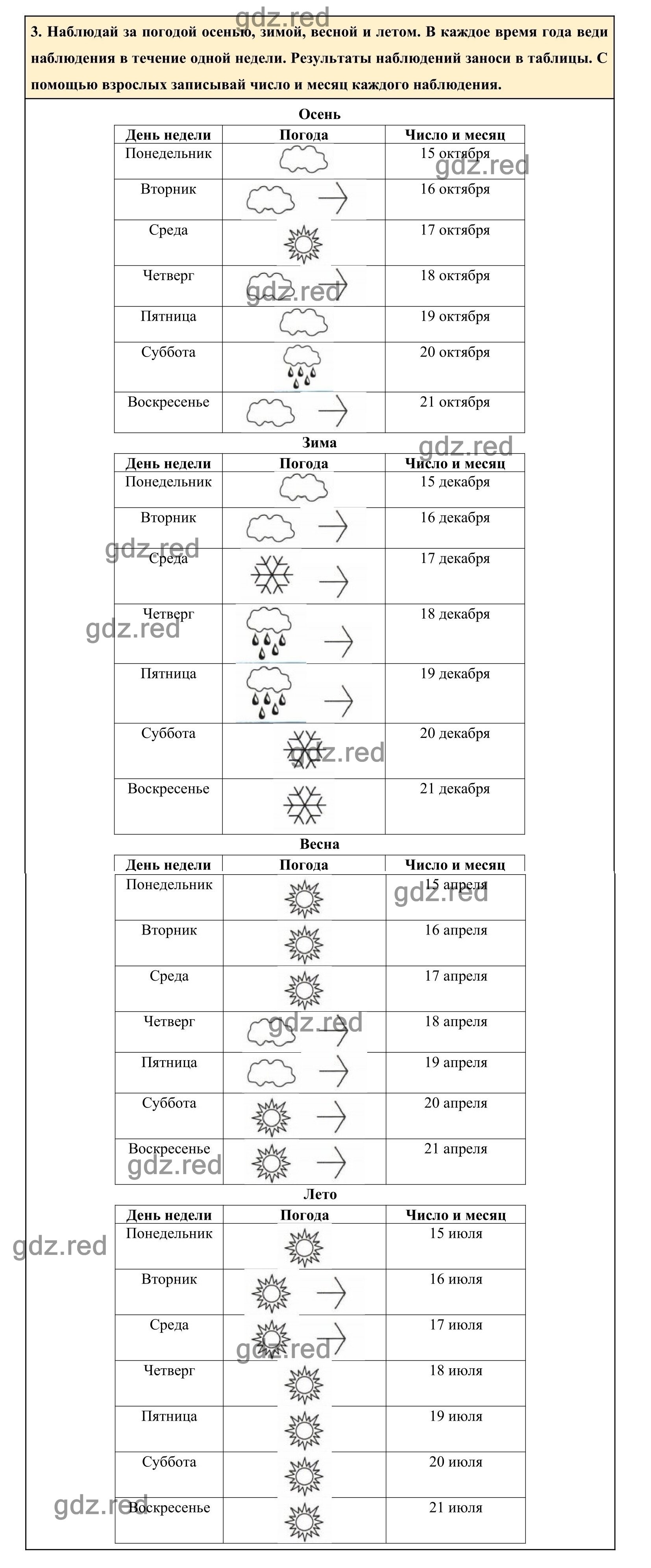 3. Наблюдай за погодой осенью, зимой, весной и летом. В каждое время года веди наблюдения в течение одной недели. Результаты наблюдений заноси в таблицы. С помощью взрослых записывай число и месяц каждого наблюдения.