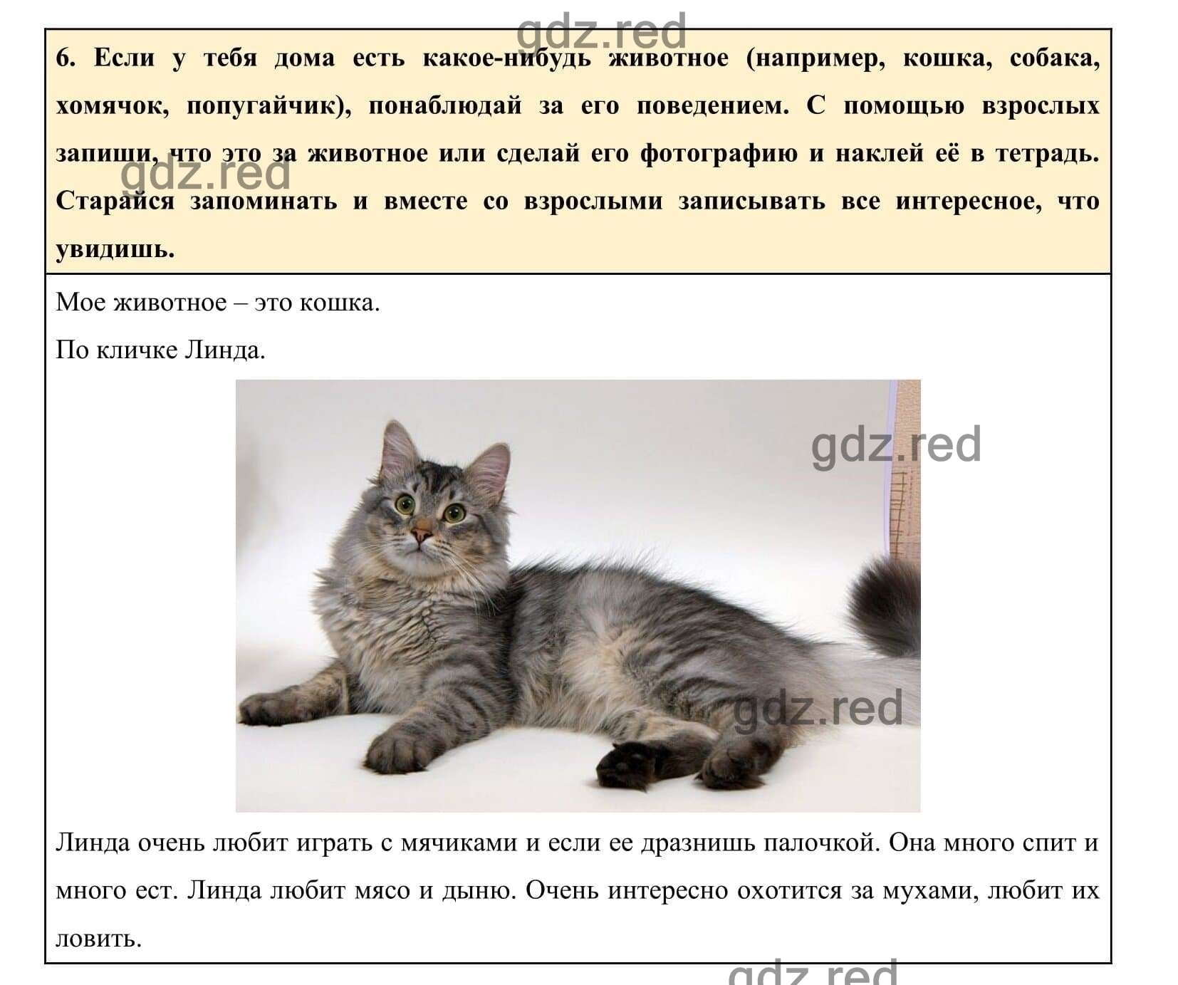 6. Если у тебя дома есть какое-нибудь животное (например, кошка, собака, хомячок, попугайчик), понаблюдай за его поведением. С помощью взрослых запиши, что это за животное или сделай его фотографию и наклей её в тетрадь. Старайся запоминать и вместе со взрослыми записывать все интересное, что увидишь.