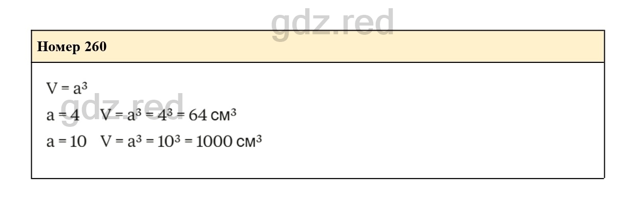 260. Объем куба зависит от длины его ребра. Пусть a см — длина ребра куба, a V — его объем. Задайте формулой зависимость V от a.