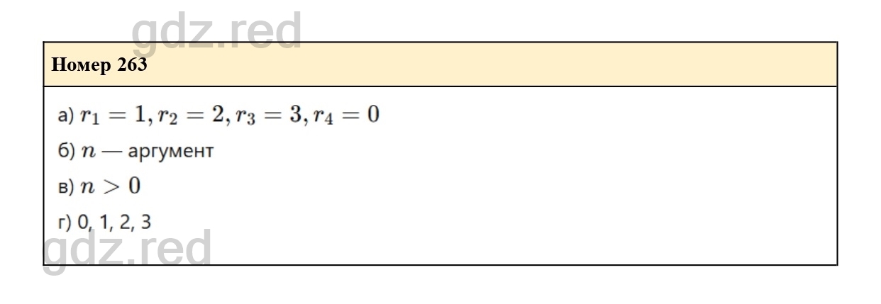 263. Каждому натуральному числу n ставится в соответствие остаток r от деления этого числа на 4. Найдите r, если n равно 13, 34, 43, 100. В рассматриваемой функциональной зависимости укажите аргумент.
