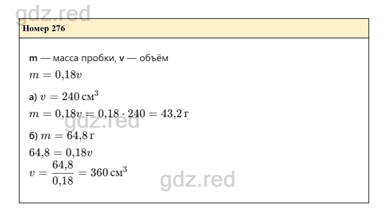 276. Задана формулой зависимость массы куска пробки от его объема, если известно, что плотность пробки равна 0,18