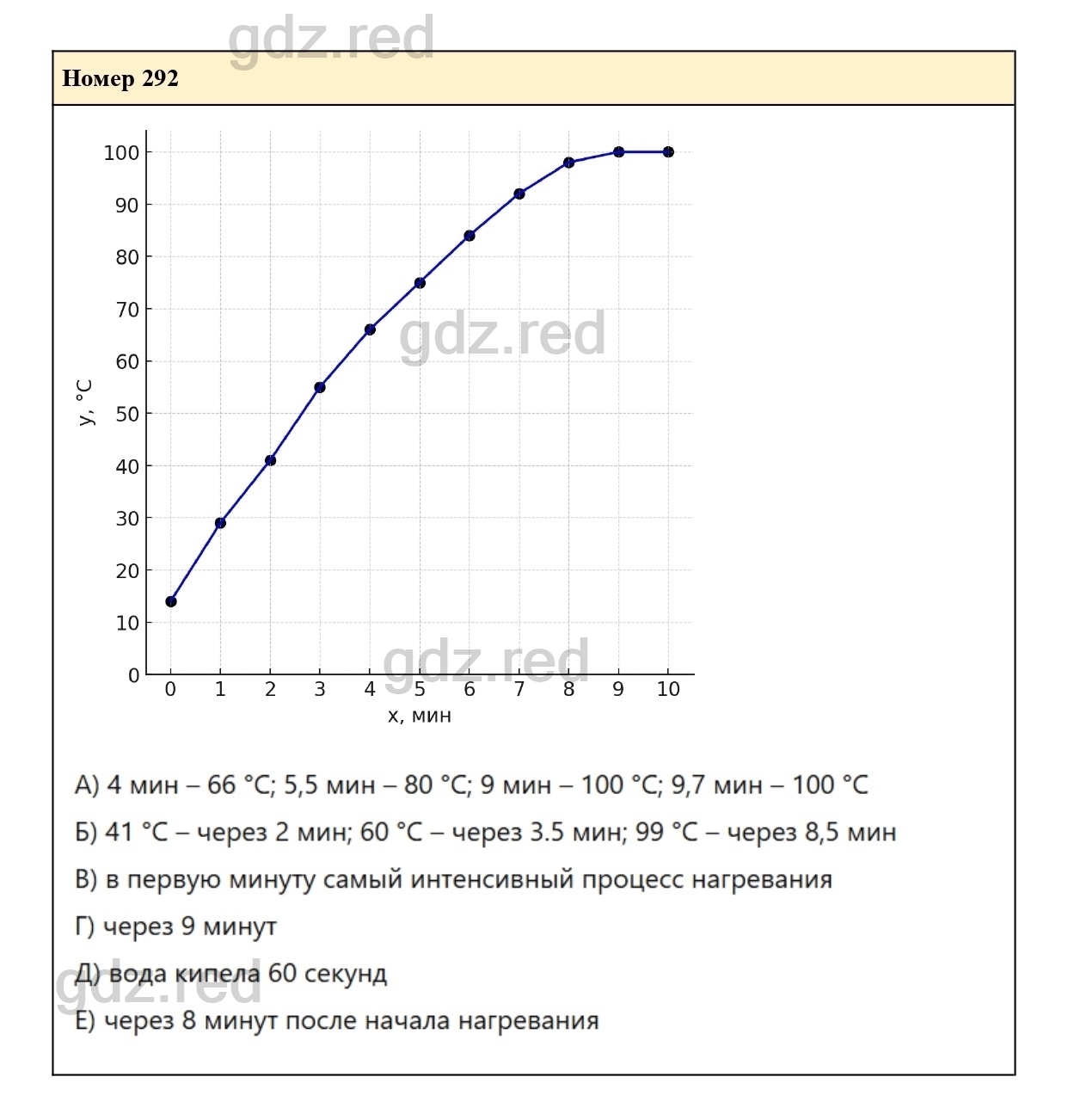 - а) какую температуру имела вода через 4 мин, через 5,5 мин, через 9 мин, через 10,7 мин после начала нагревания;
