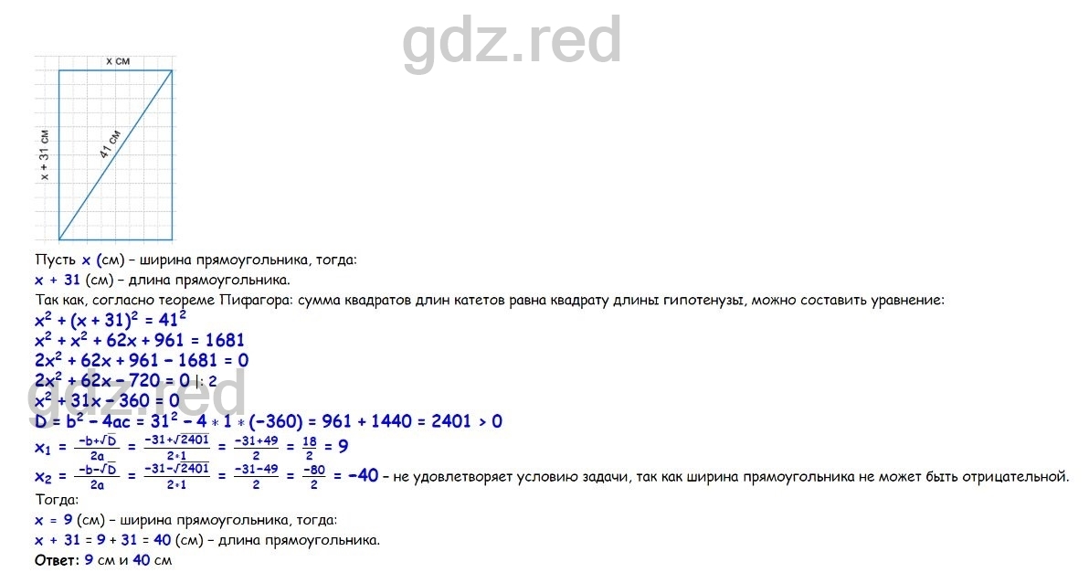 677. Найдите стороны прямоугольника, если их разность равна 31 см, а диагональ прямоугольника равна 41 см.
