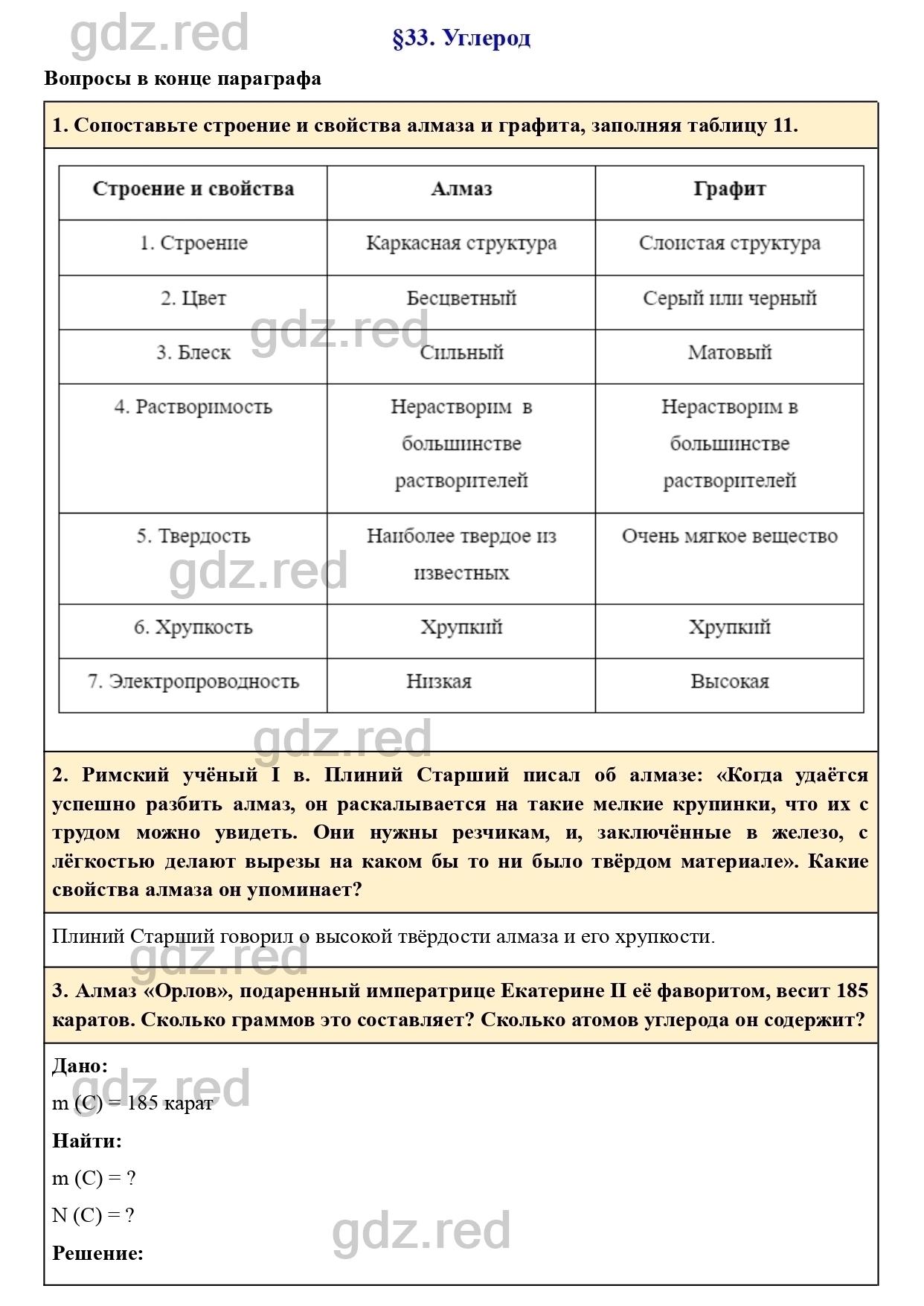 3. Алмаз «Орлов», подаренный императрице Екатерине II её фаворитом, весит 185 каратов. Сколько граммов это составляет? Сколько атомов углерода он содержит?