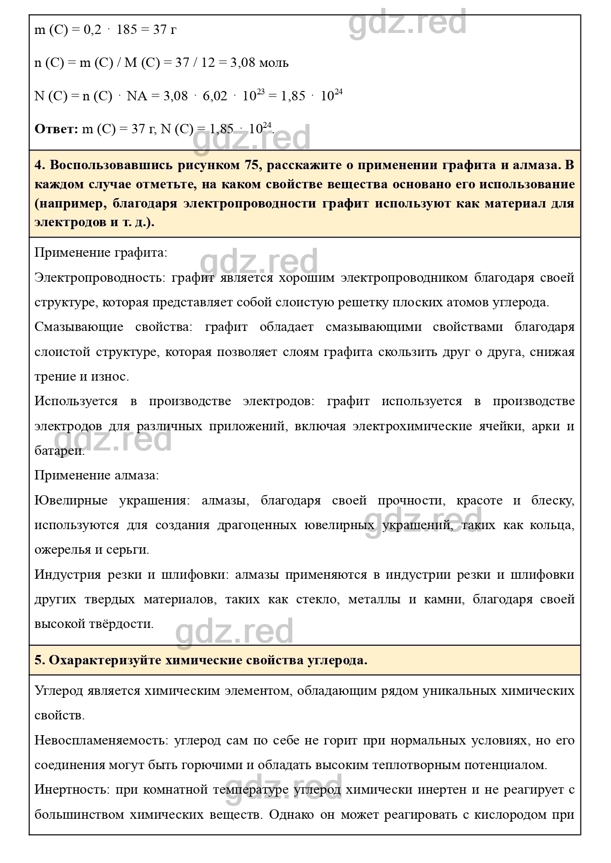 4. Воспользовавшись рисунком 75, расскажите о применении графита и алмаза. В каждом случае отметьте, на каком свойстве вещества основано его использование (например, благодаря электропроводности графит используют как материал для электродов и т. д.).