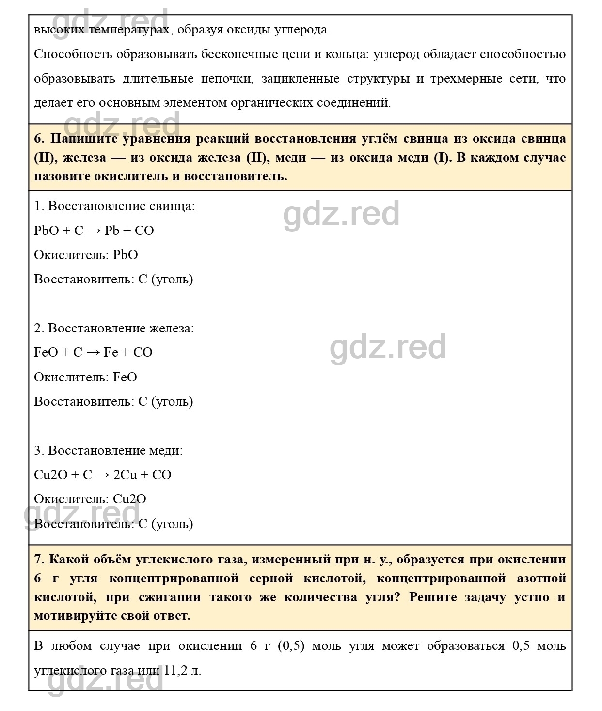 6. Напишите уравнения реакций восстановления углём свинца из оксида свинца (II), железа — из оксида железа (II), меди — из оксида меди (I). В каждом случае назовите окислитель и восстановитель.